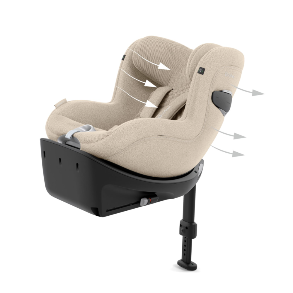 Sirona Ti оснащене вкладкою для новонароджених (40–60 см), яка легко знімається в міру росту дитини. Підголівник регулюється в 12 положеннях однією рукою, автоматично адаптуючи ремені безпеки. Система вентиляції з тканиною 3D-Mesh і вентиляційними отворами забезпечує постійну циркуляцію повітря.