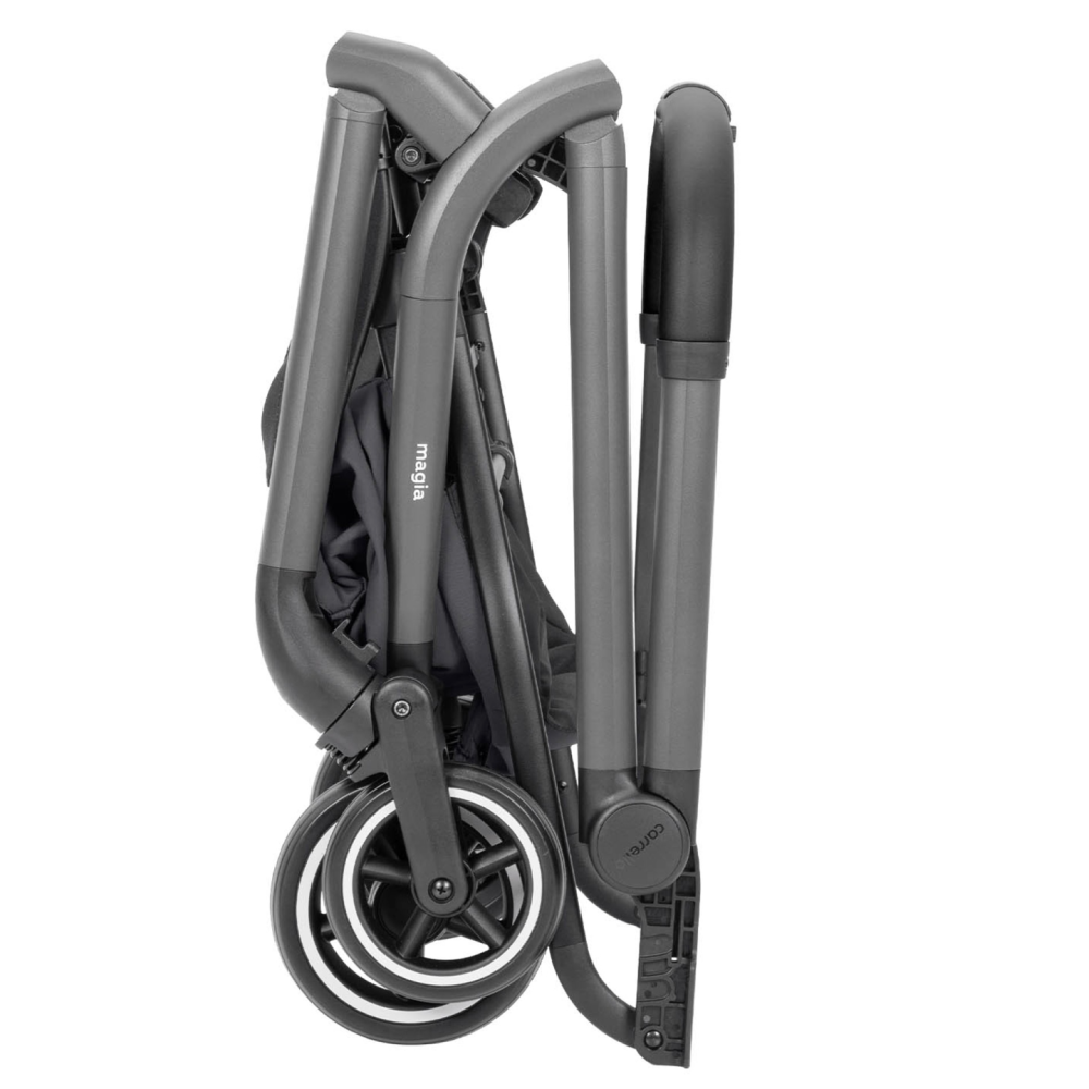 Carrello Magia оснащена анатомічним матрациком, п’ятиточковими ременями безпеки з м’якими накладками та магнітним замком. Маневрені гумові колеса (передні 13 см, задні 15 см) забезпечують плавний хід, а передні колеса мають фіксацію в положенні «прямо».