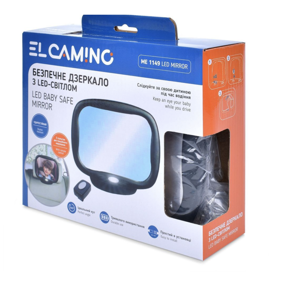 Дзеркало заднього виду з підсвічуванням El Camino LED ME 1149 призначене для спостереження за дитиною в автомобілі. Дзеркало з пультом керування, має широкий кут огляду, легко встановлюється у будь-якому напрямку, забезпечує відмінний вид на дитину.