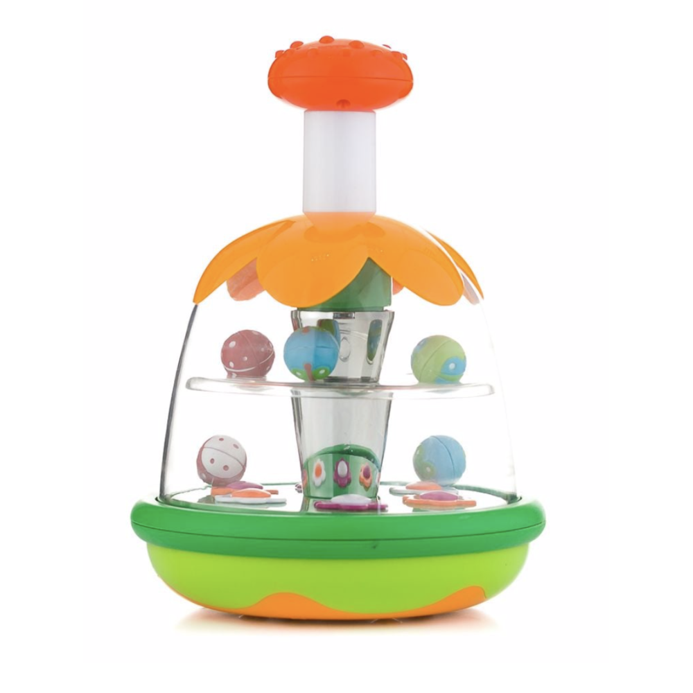 - При натисканні на ручку всередині дзиґа починають обертатися барвисті кульки-букашки, видаючи при цьому кумедні звуки.