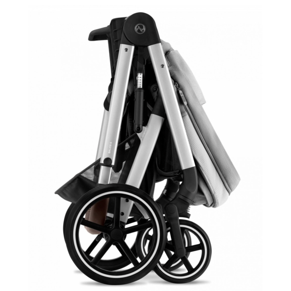 Шасі коляски Сайбекс Баліос продумано до дрібниць. Легко і просто складається шасі разом з прогулянковим сидінням, тип складання - "книжка". Коляска в складеному вигляді стійко стоїть вертикально і займає дуже мало місця. Ви можете складену коляску розмістити у себе вдома в будь-якому місці.