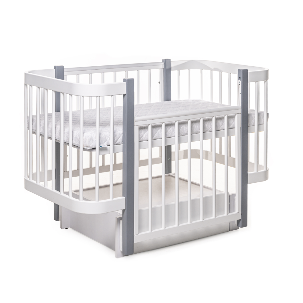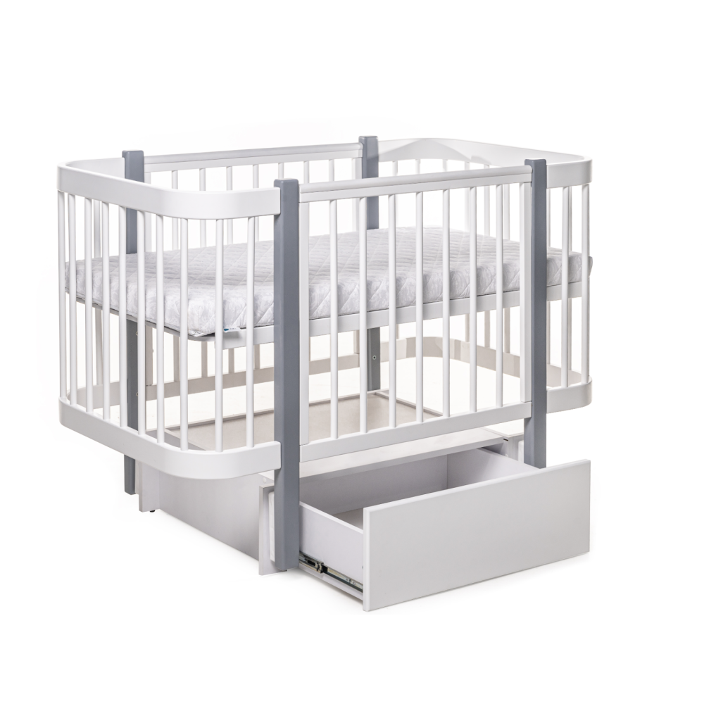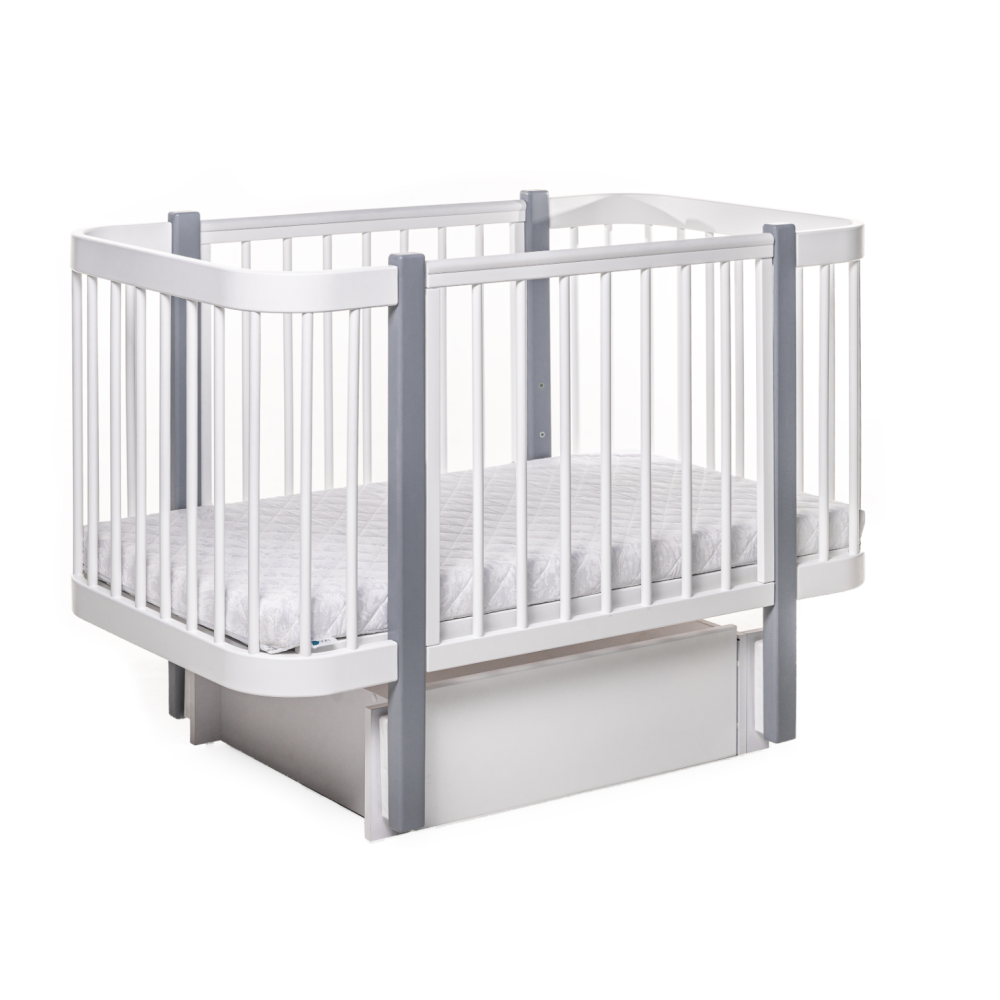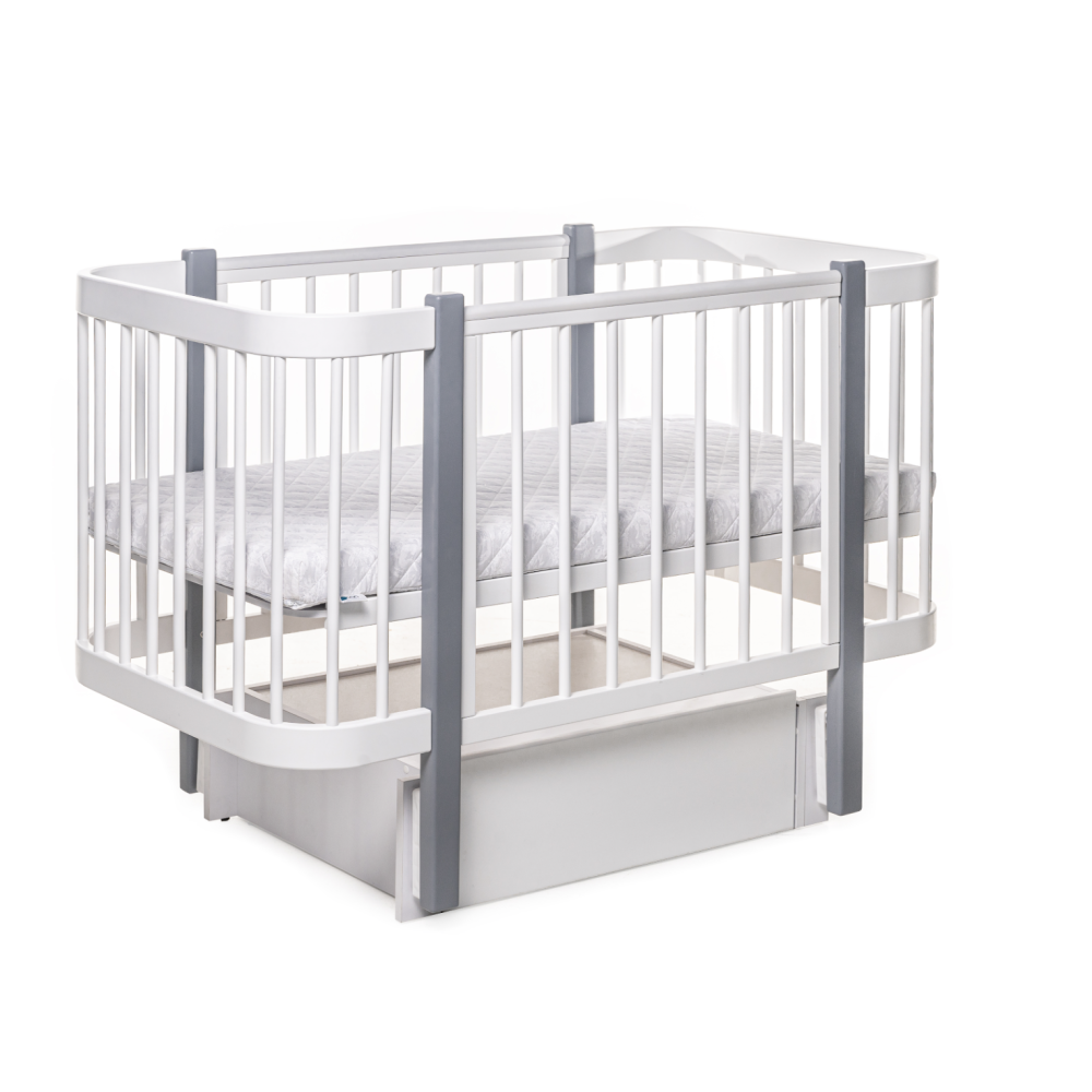 Виготовлене з дерева бук, покрите нетоксичним лаком та фарбою на водяній основі, які рекомендовано для дитячих меблів. Ліжко має 3 положення спального місця по висоті, а також рухому бічну частину, яка може опускатися і зніматися повністю. Поздовжній механізм заколисування входить в комплектацію ліжечка.