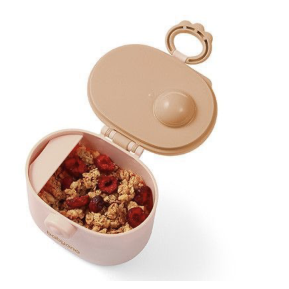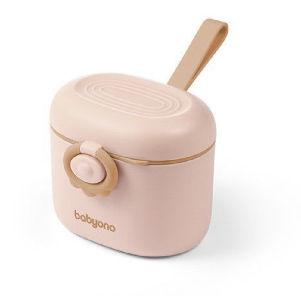 Контейнер має герметичне закривання, яке надійно захищає сухе молоко від вологи та зберігає його свіжість. Ложечка у комплекті дозволяє точно відмірювати порції, а вбудована поперечина допомагає набирати потрібну кількість суміші без розсипання. Завдяки силіконовій ручці контейнер зручно брати із собою в дорогу або на прогулянку.