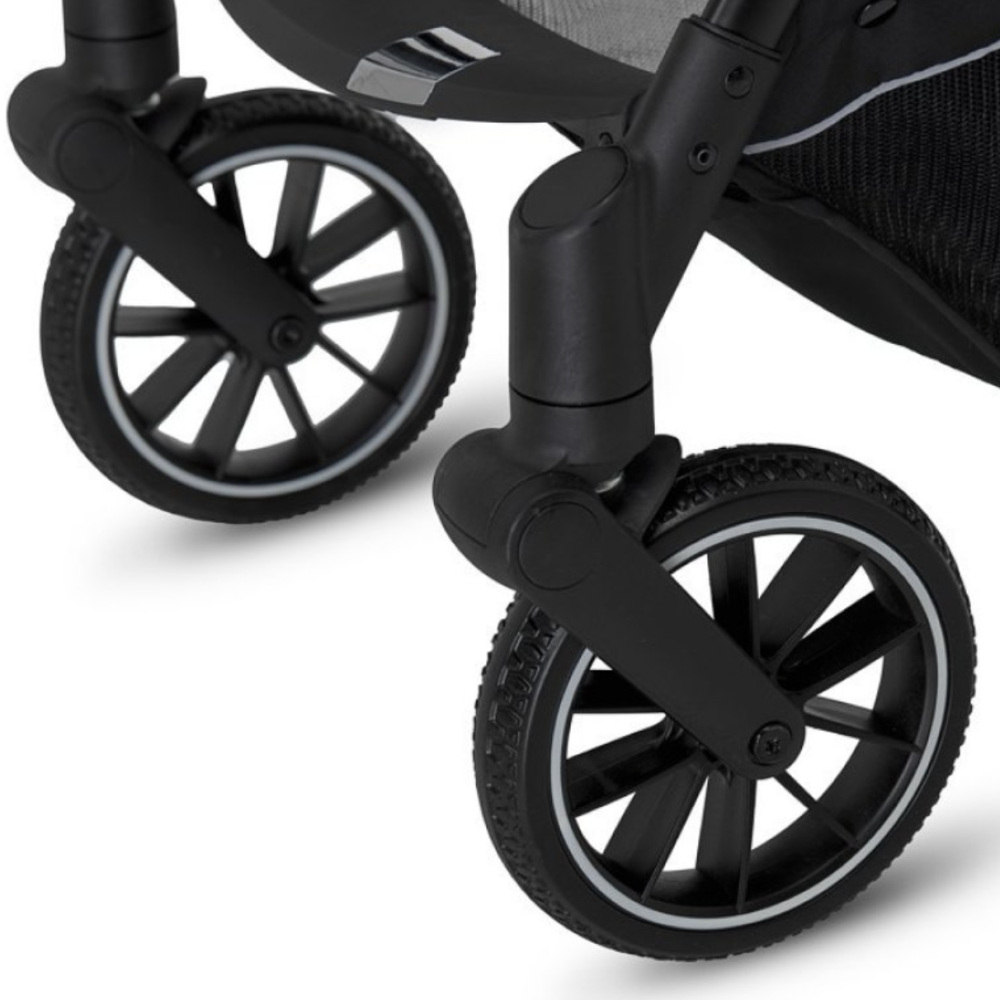 - Коляска має великі непробивні колеса з повною амортизацією.
