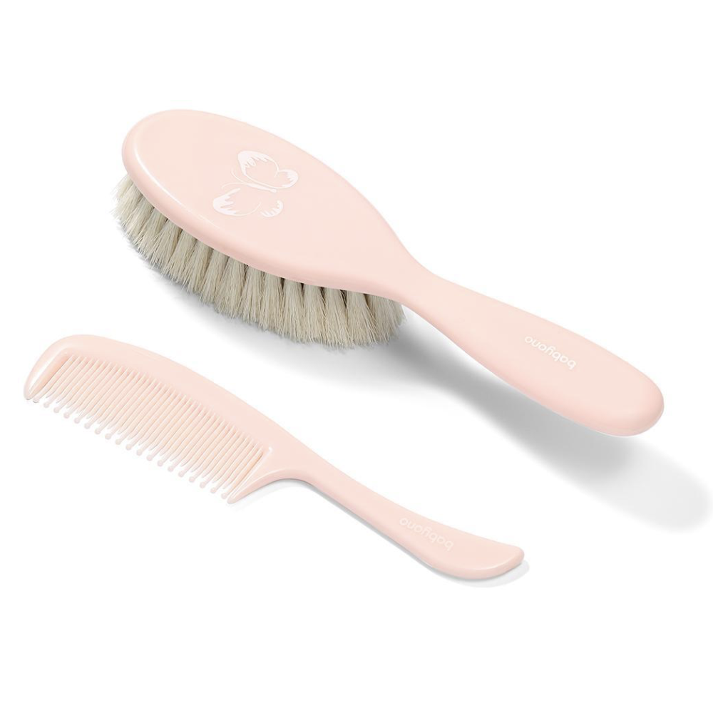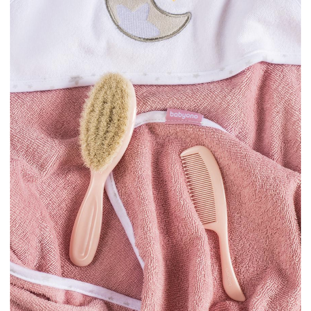 М’яка щітка для волосся з ніжною натуральною щетиною призначена для догляду за немовлятами. Вона прекрасно масажує шкіру дитини і завдяки своїм антистатичним властивостям не електризує волосся. Гребінець, що входить в комплект, має округлі зубці, завдяки чому шкіра дитини не подразнюється.