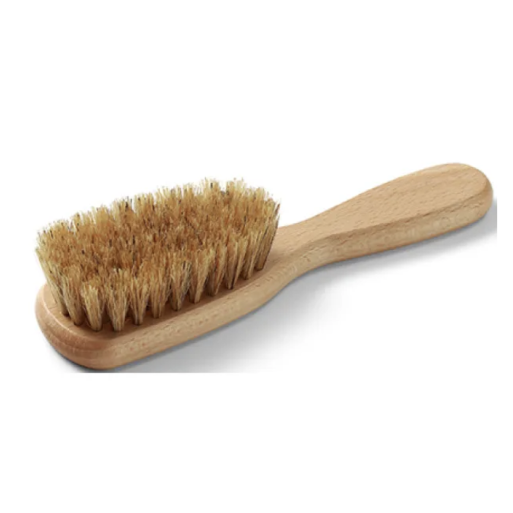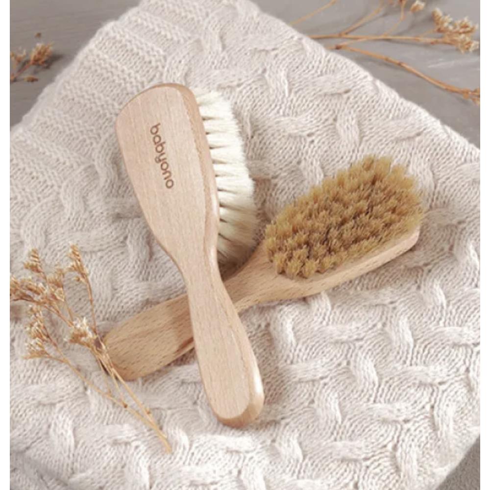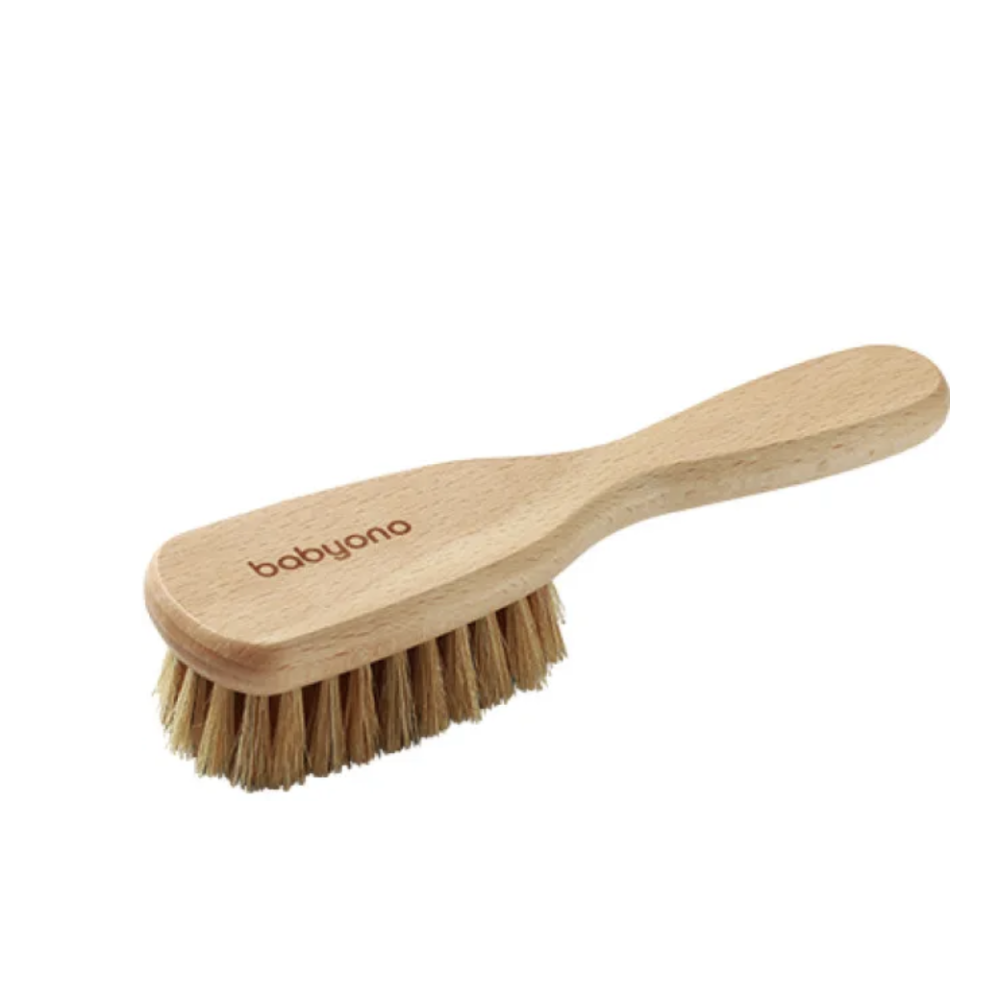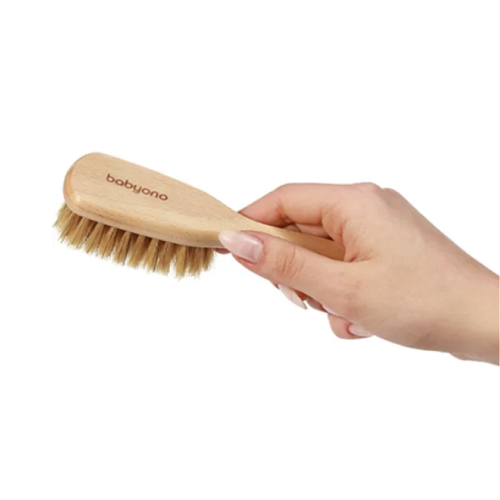 Щітка виготовлена з натуральної щетини 100% і сертифікованої букової деревини, що забезпечує максимальну делікатність під час розчісування. Вона ідеально підходить для чутливої шкіри голови немовляти з перших днів життя.