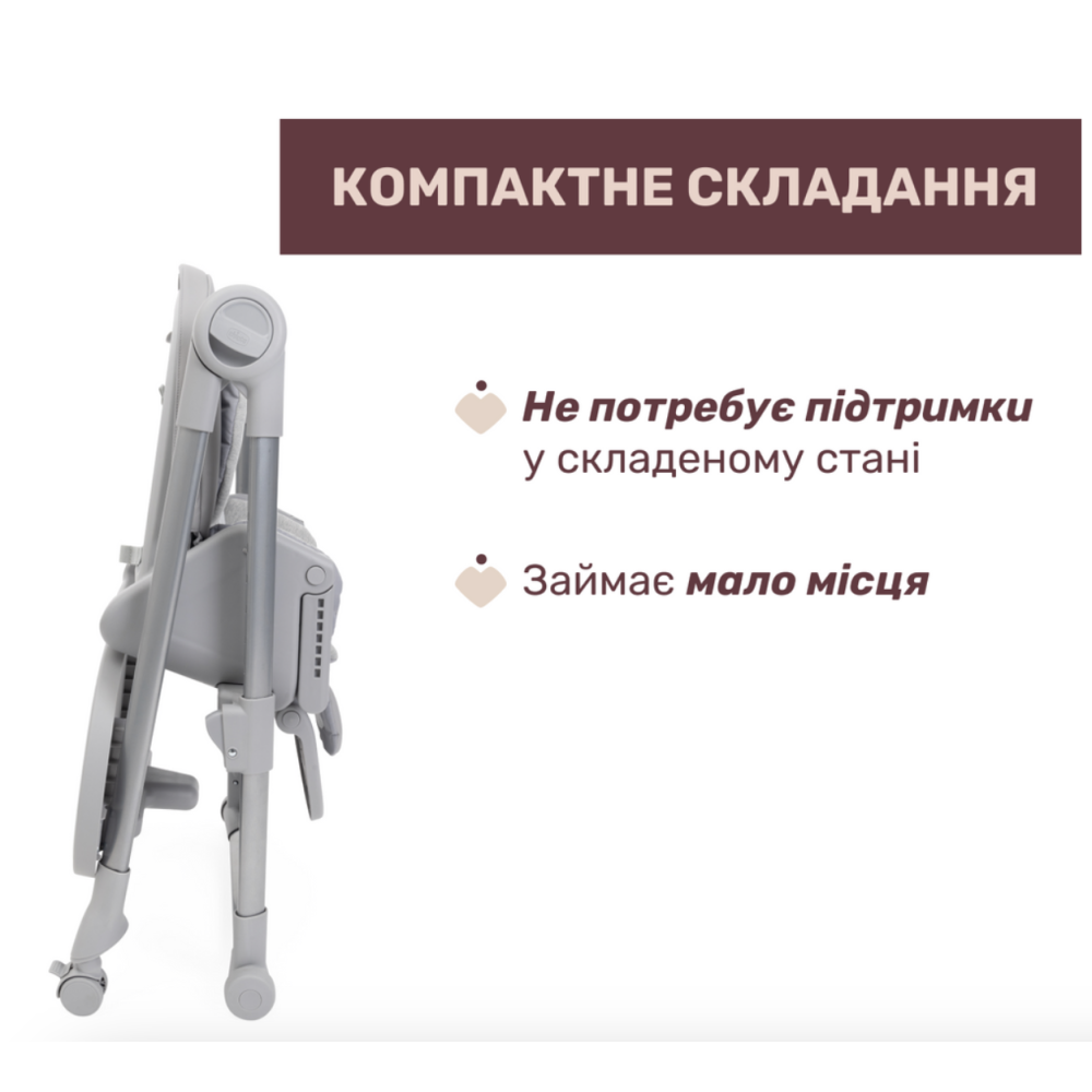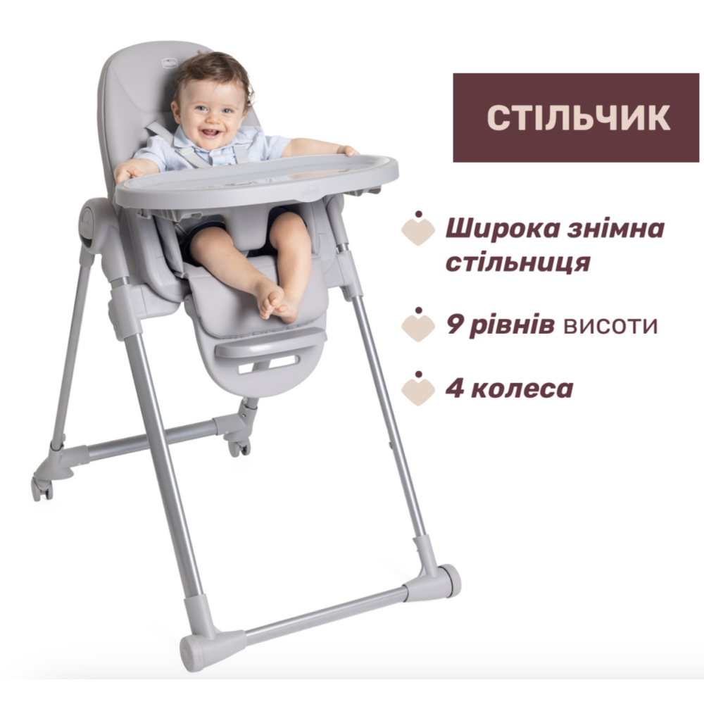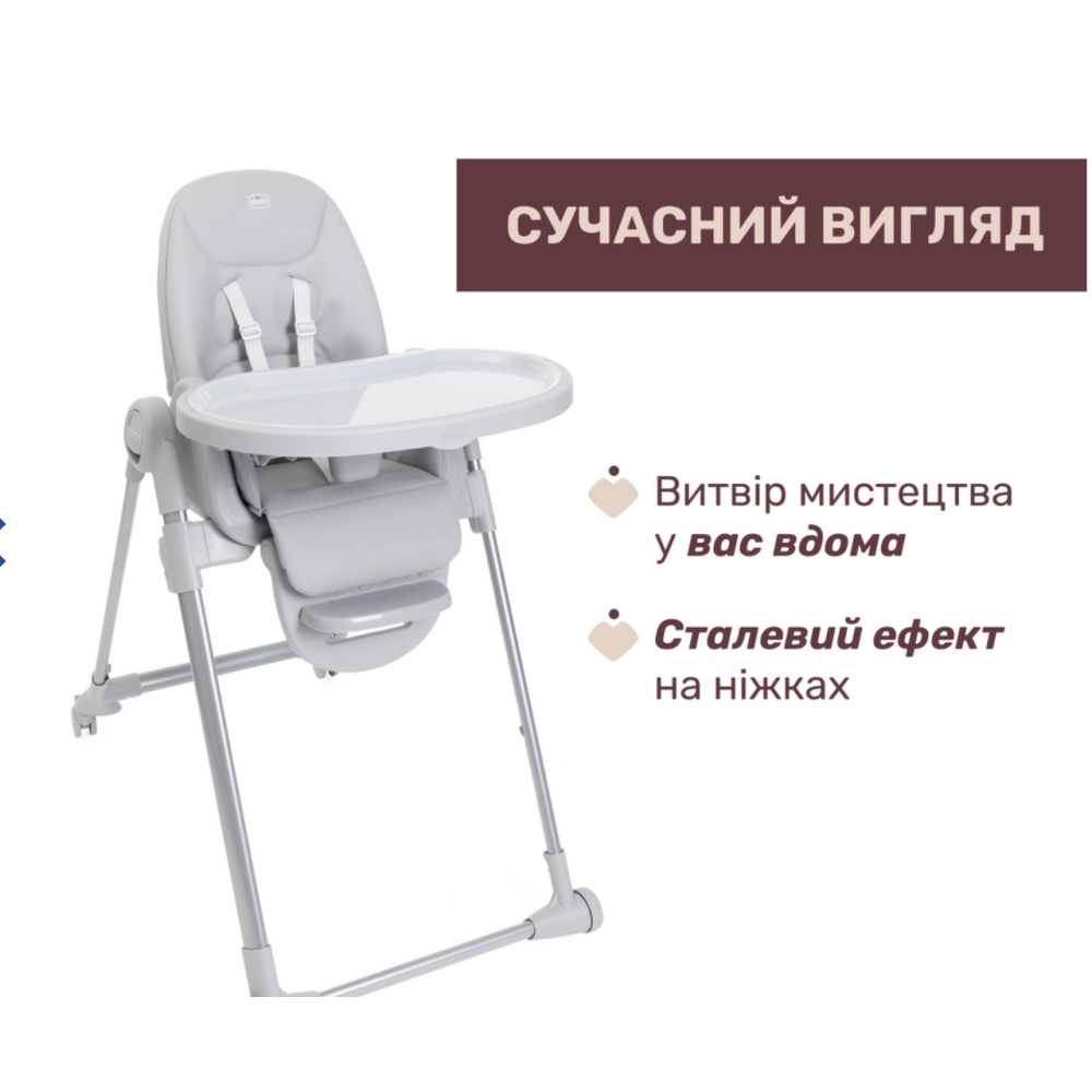 - Велика стільниця – регулюється по глибині, легко знімається для очищення та фіксується на ніжках стільчика.